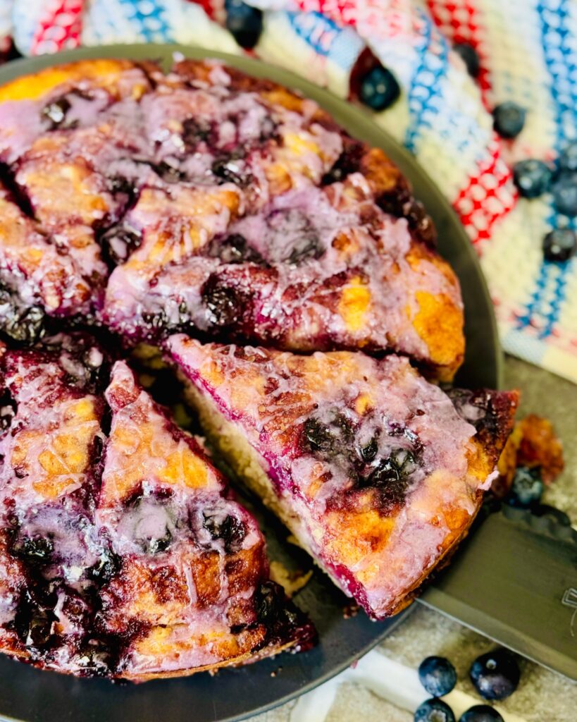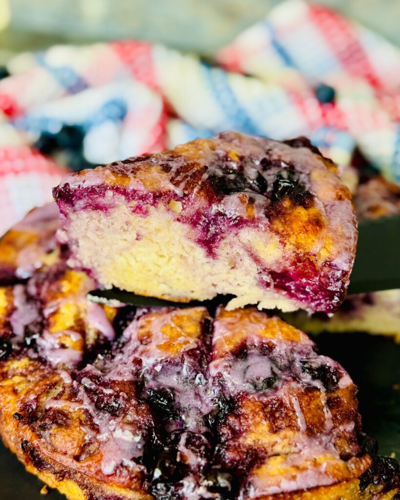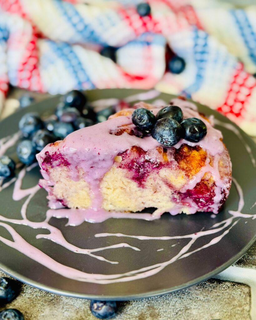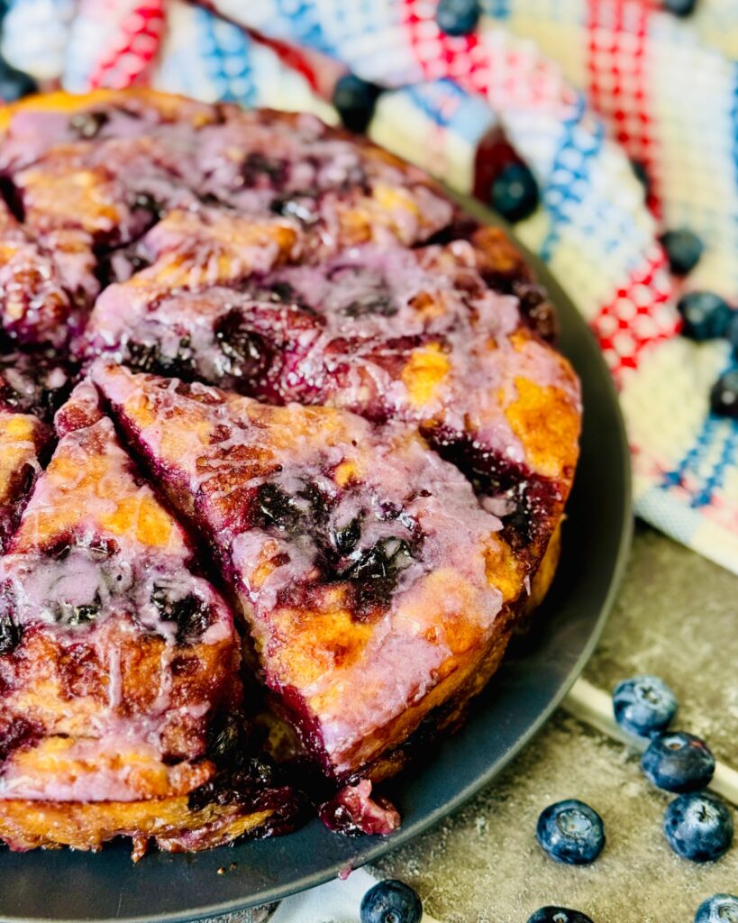 Once your Blueberry Butter Swim Biscuits are out of the oven, let it cool down in the baking pan for about 5 minutes. I like mine still warm with blueberry glaze on top!