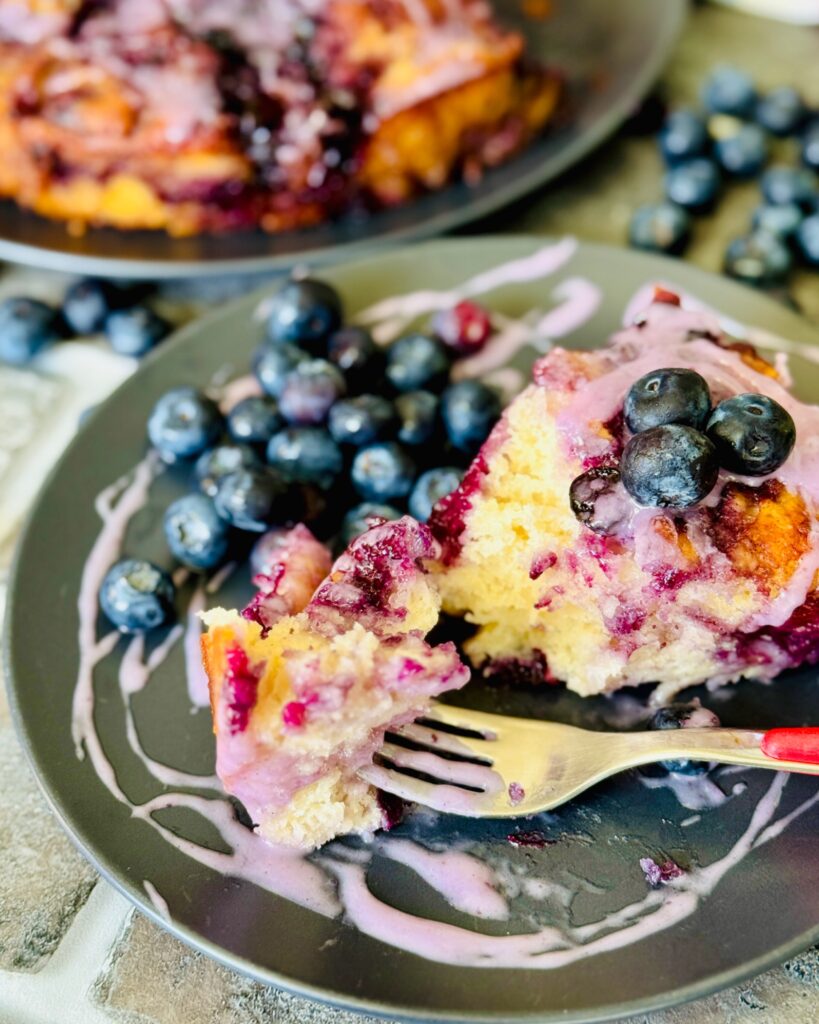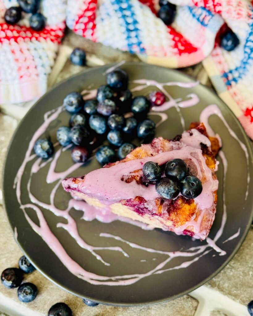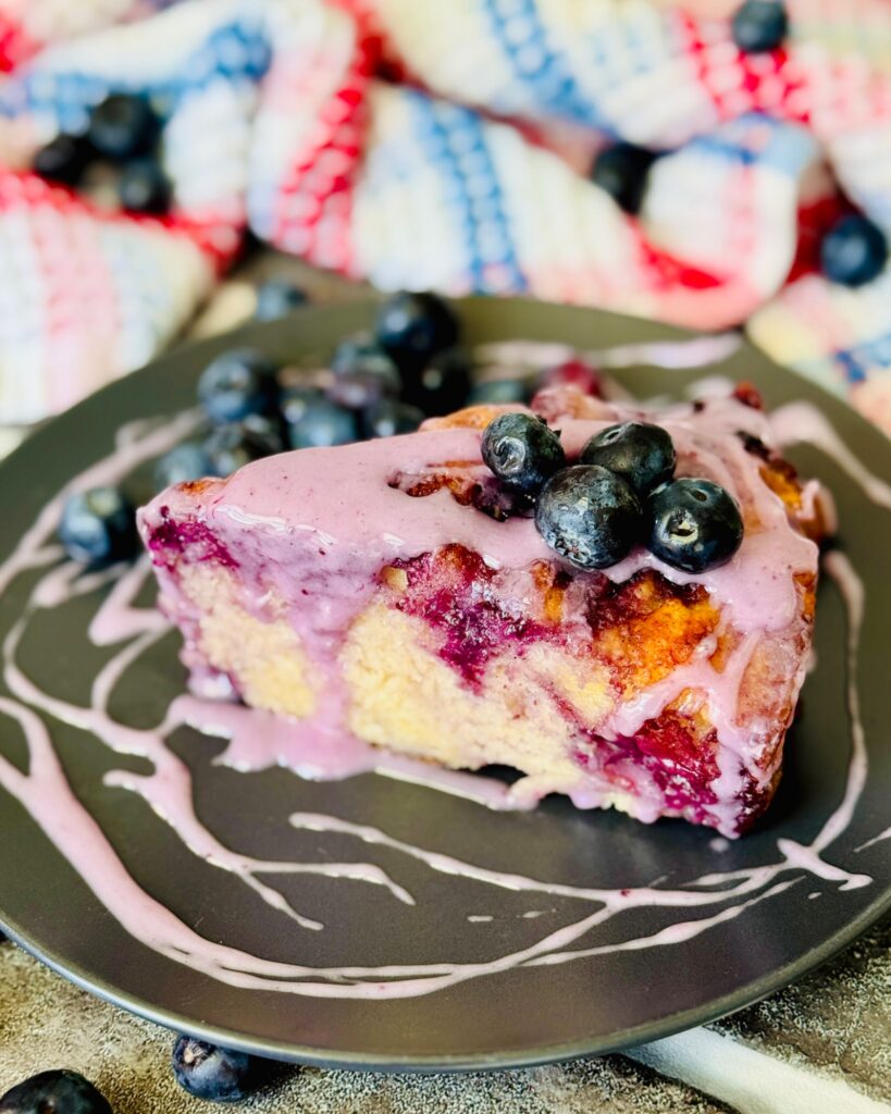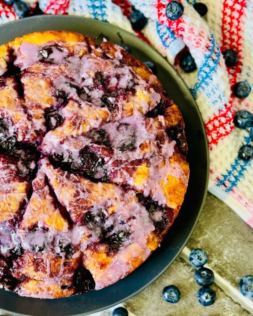 Once your Blueberry Butter Swim Biscuits are out of the oven, let it cool down in the baking pan for about 5 minutes. I like mine still warm with blueberry glaze on top!