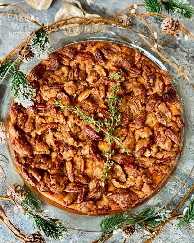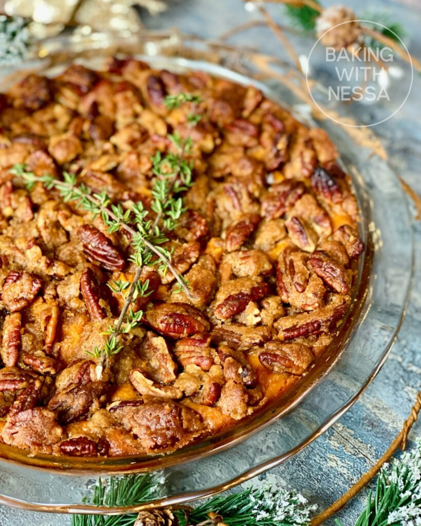 Once your Classic Sweet Potato Casserole is out of the oven, allow to cool for 10-20 minutes, then top with a little fresh thyme or rosemary and a sprinkle of sea salt. Serve warm. Enjoy! Autumn Leaves & Pumpkins Please!NOTE: Cover and refregirate any leftovers. Consume within 3 days. Reheat at 350℉/180℃ until internal temperature reaches 165℉ | 75℃.