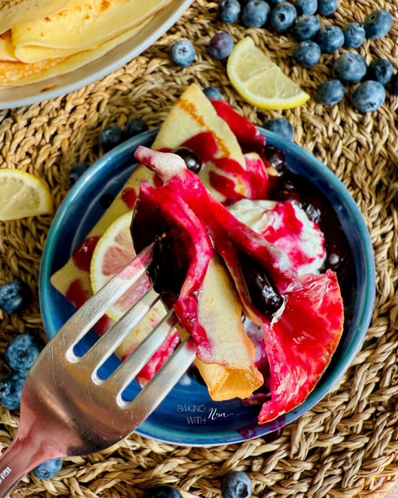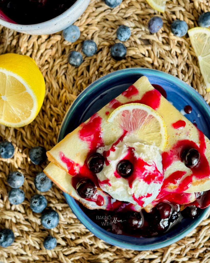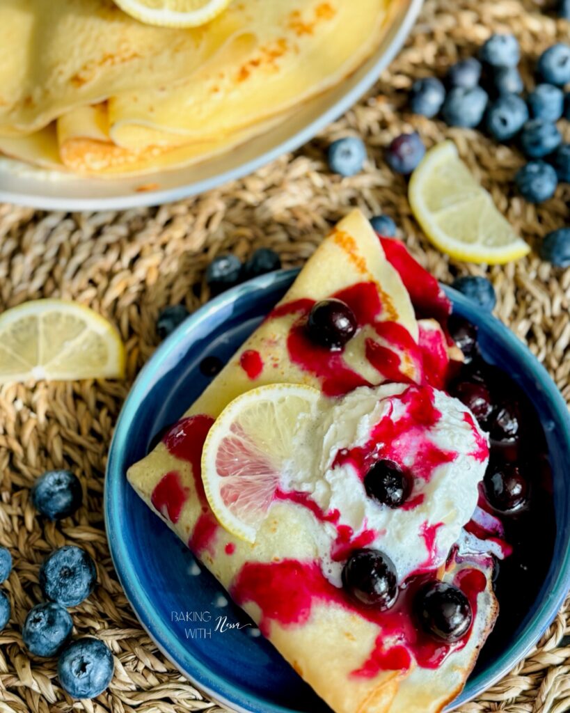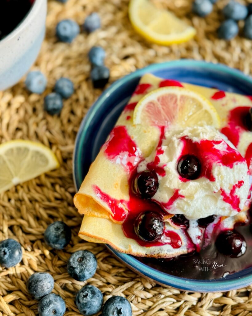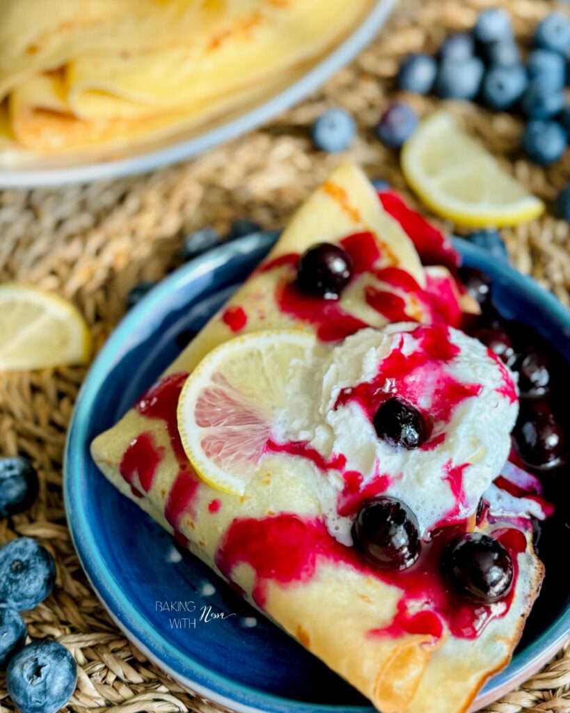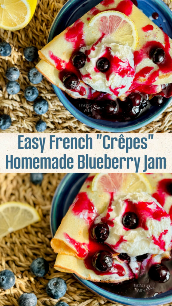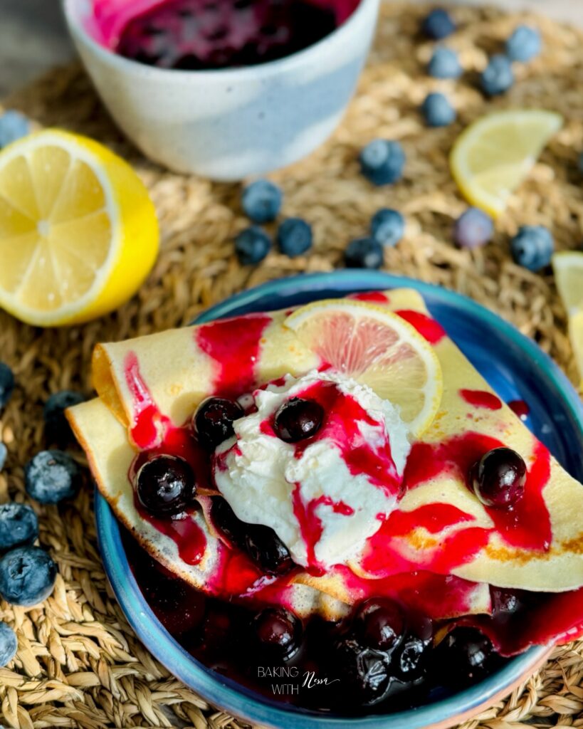 When ready to enjoy, place one crêpe on a plate. Scoop the blueberry jam on one side, then fold it twice. Serve with Chantilly, fresh blueberries and extra blueberry jam on the side. Enjoy & Bon Appétit!