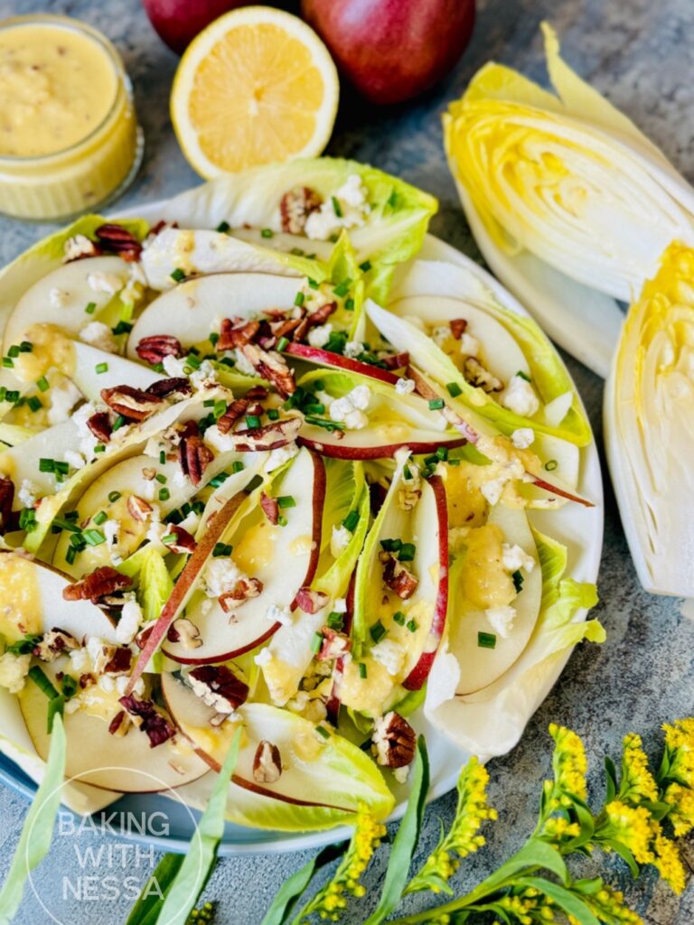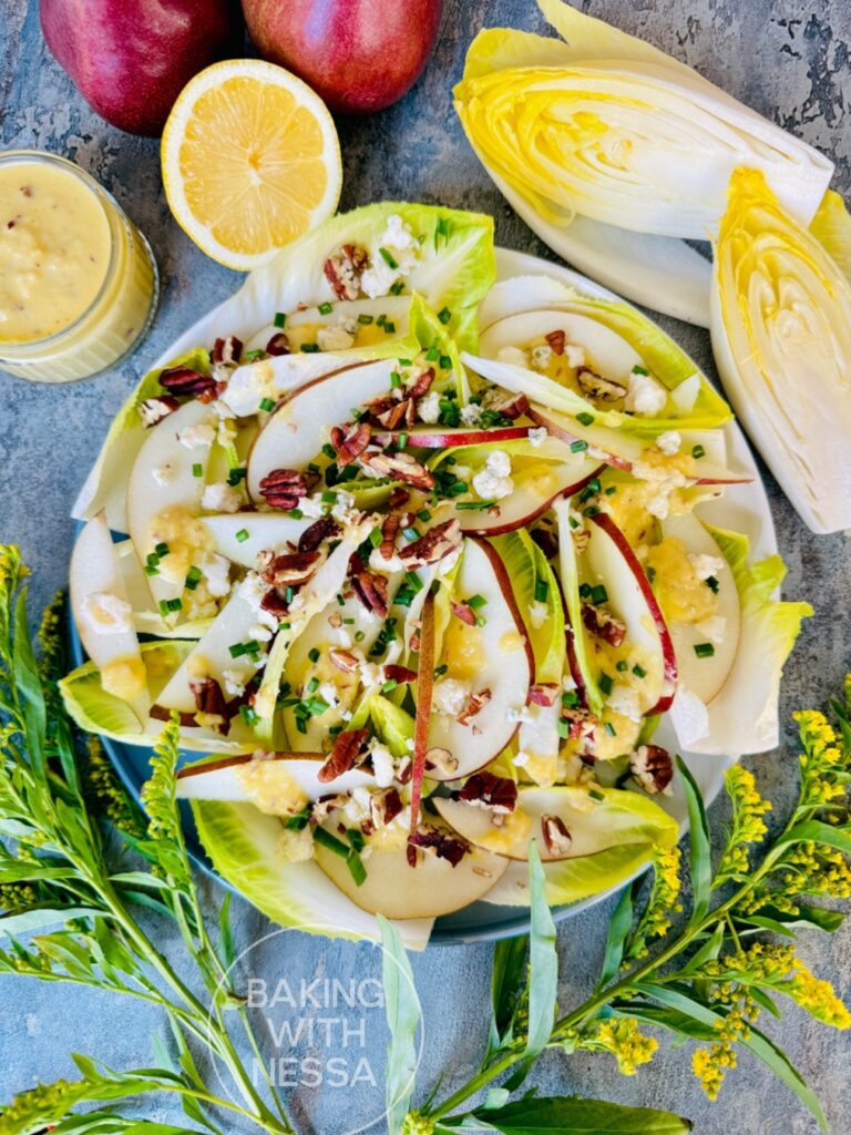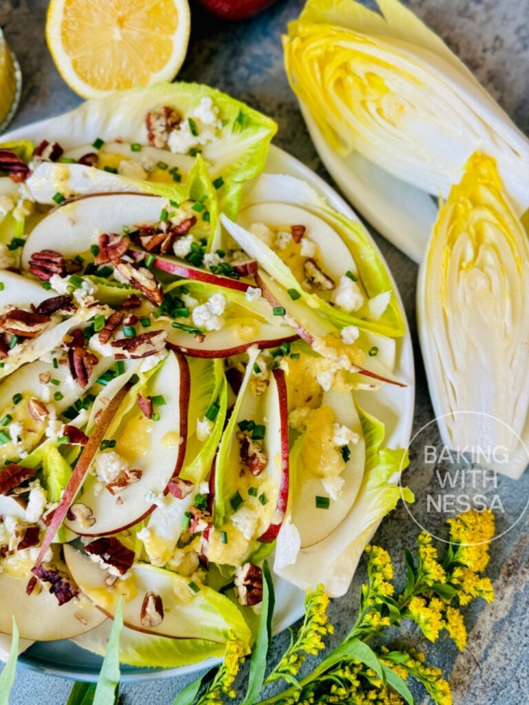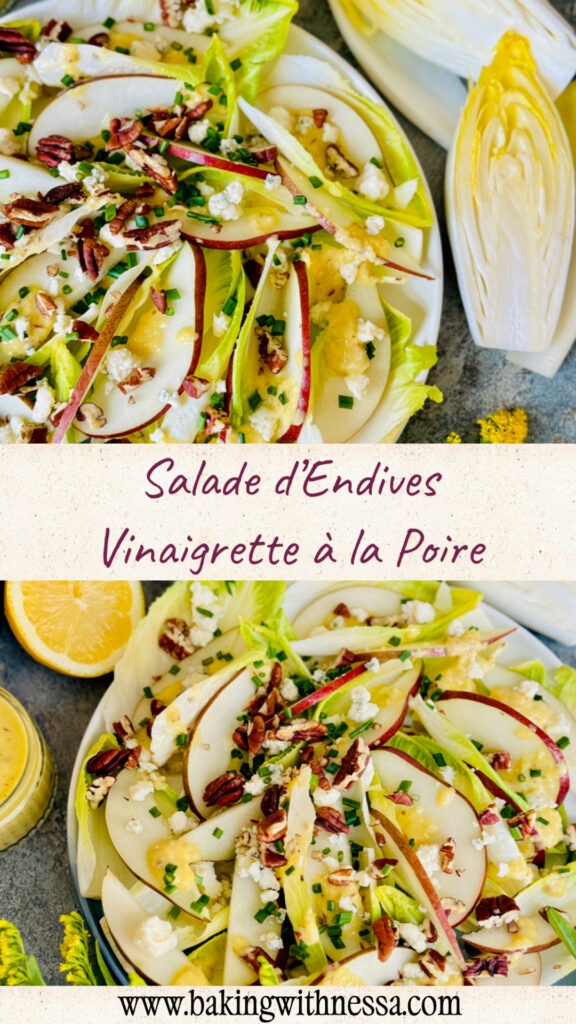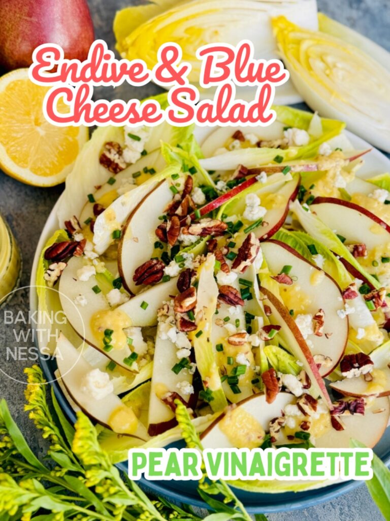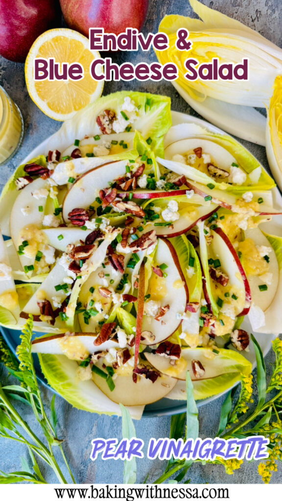 This Endive and Blue Cheese Salad with Pear Vinaigrette is crisp, elegant, and full of cozy bistro flavor. Made with crunchy endive, creamy blue cheese, and a sweet homemade pear dressing, it’s perfect for holiday dinners, fall entertaining, Thanksgiving, Christmas, or an easy gourmet side salad. Save this beautiful French-inspired salad recipe for your next dinner party!