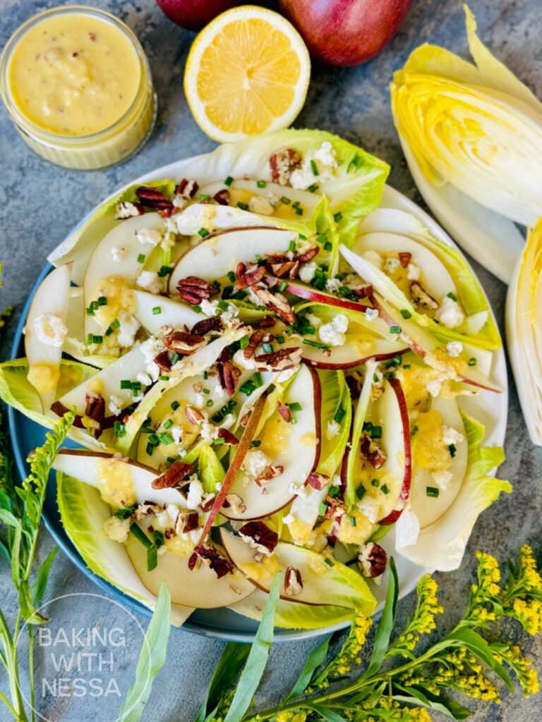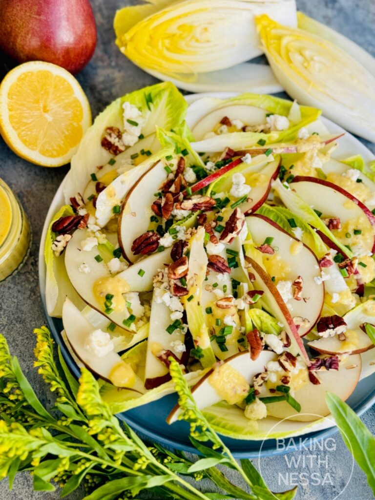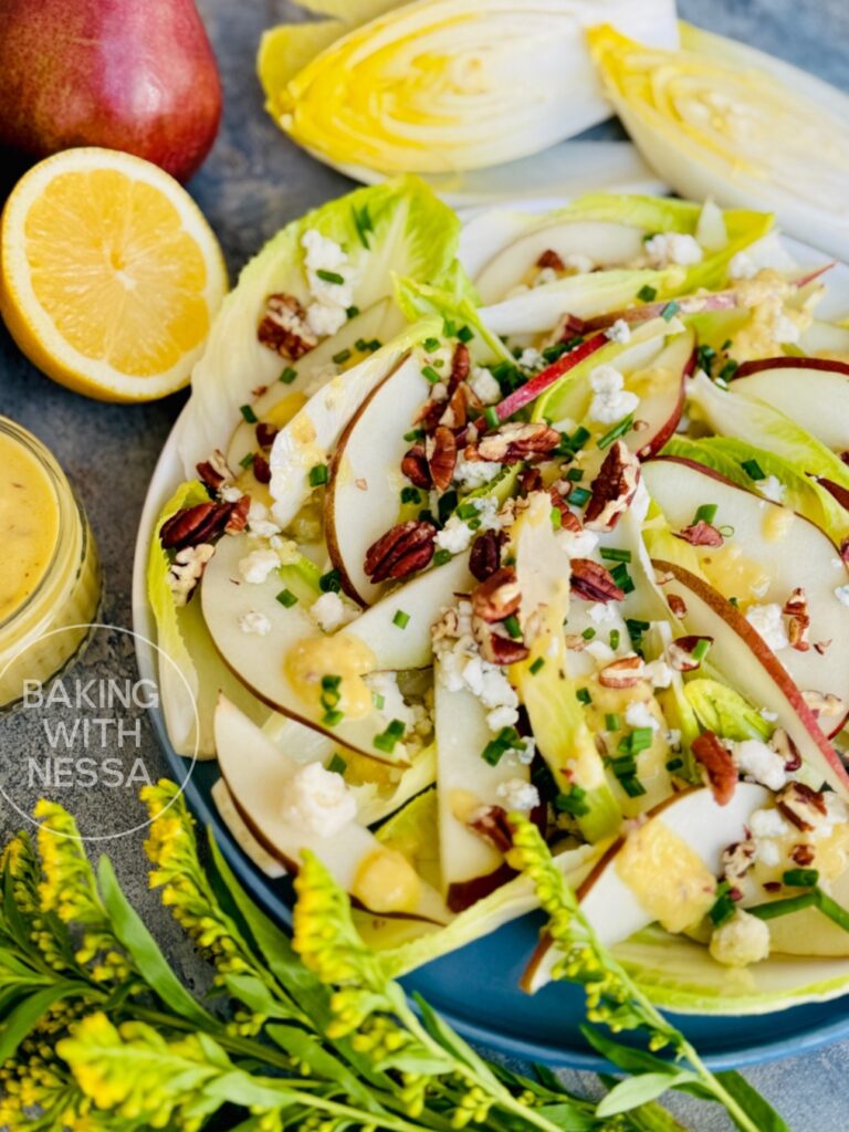 Spread the endive leaves and sliced pears out on a serving platter. Drizzle with the dressing. Sprinkle with the Blue Cheese, chives, pecans, and serve. Enjoy & Bon Appétit!
