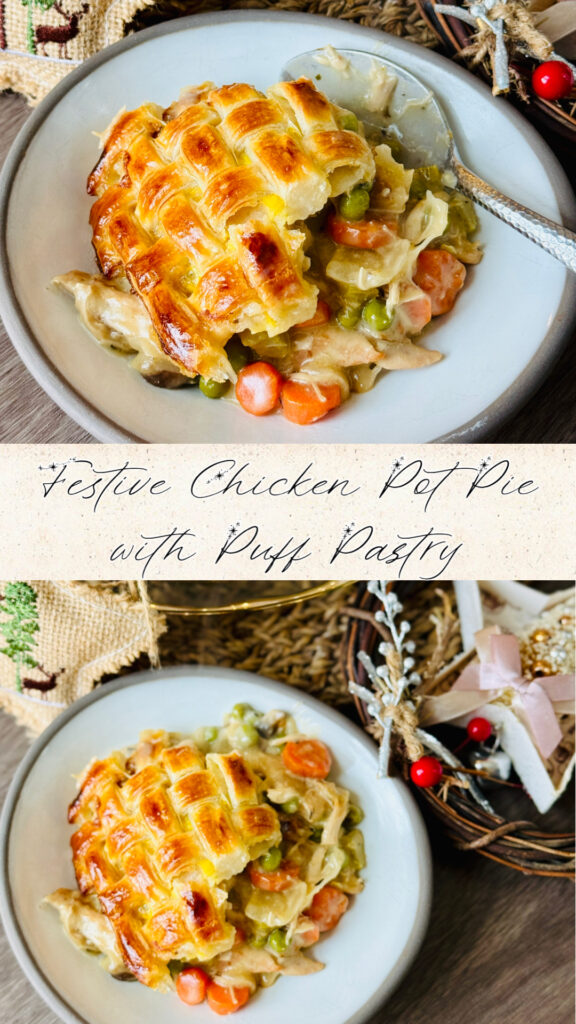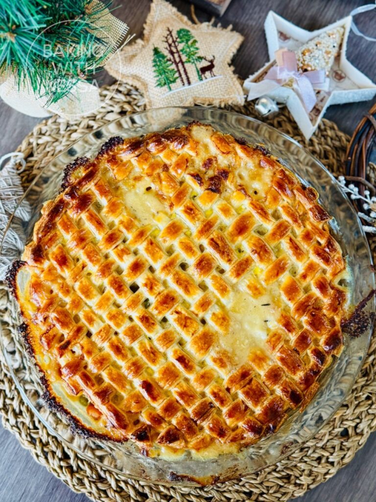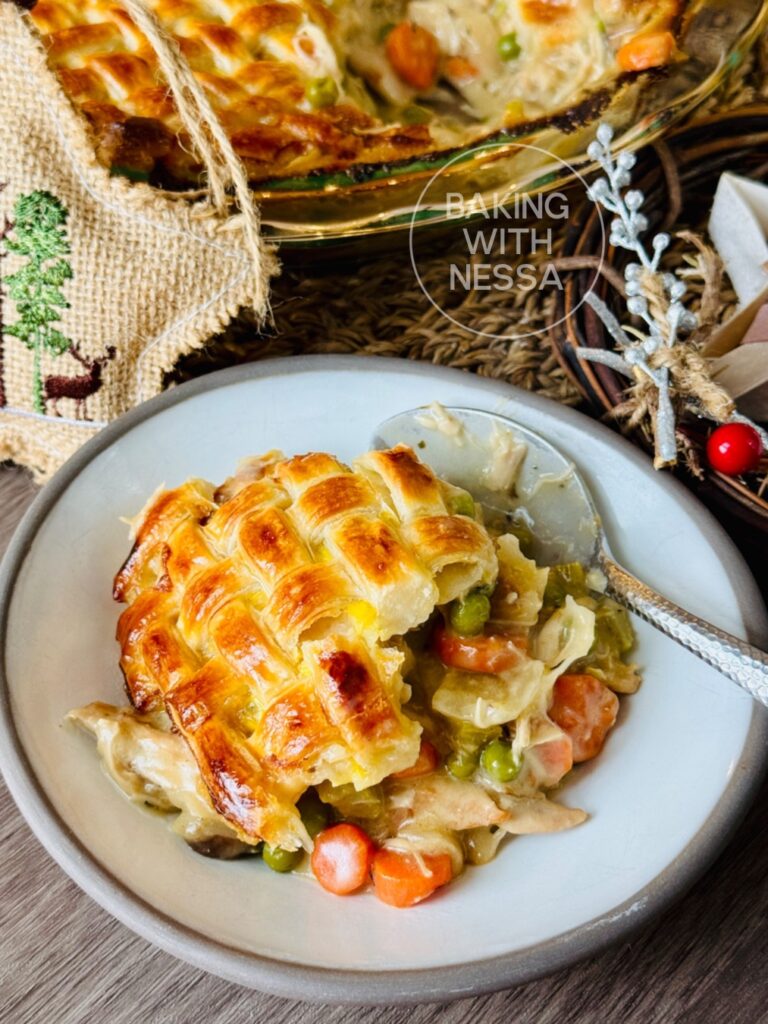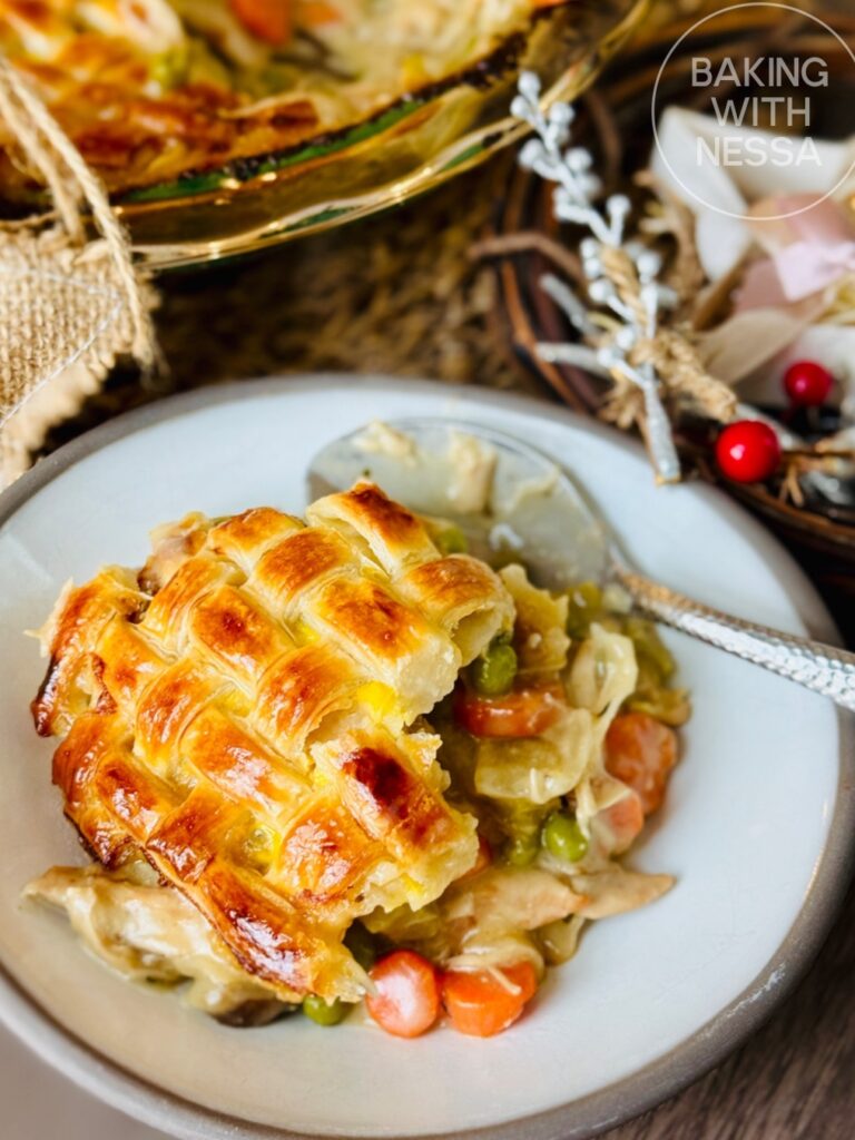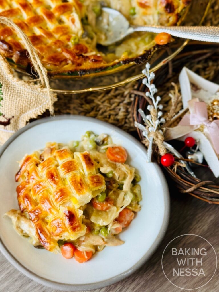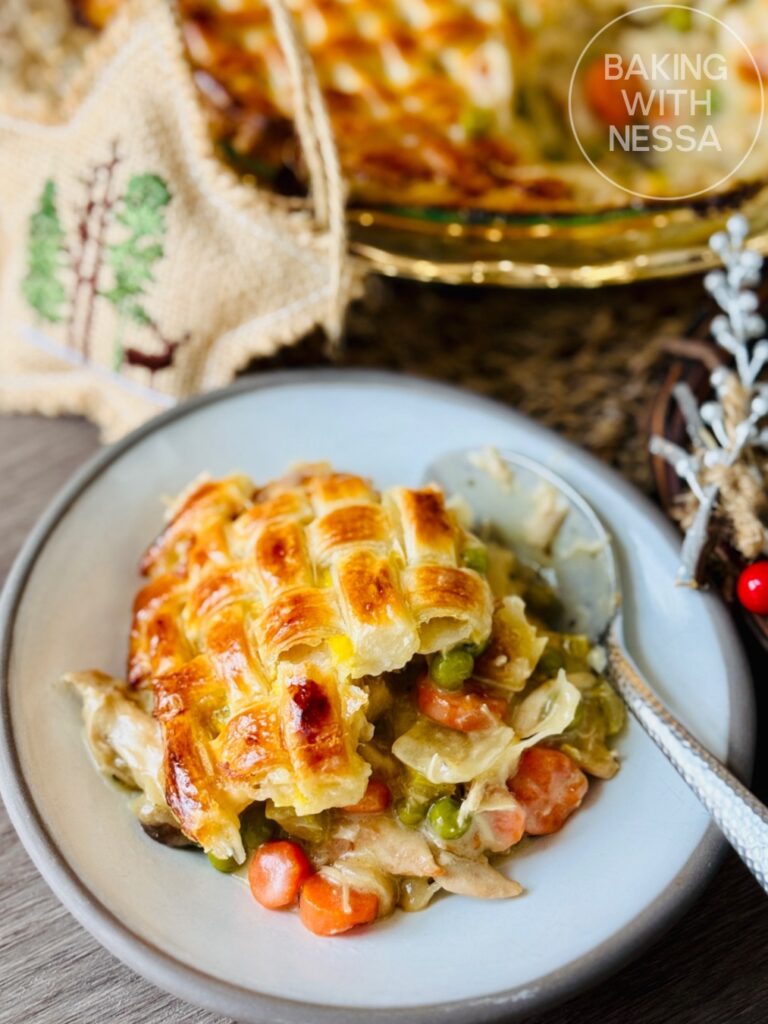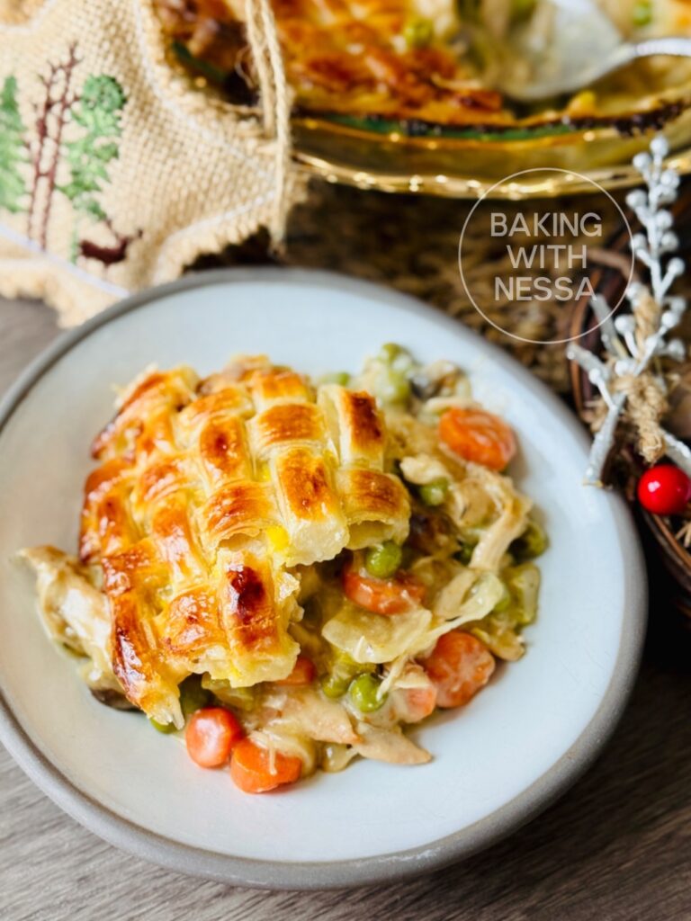 2 oz butter, 2 Tbsp olive oil, 2 carrots, 2 celery ribs, 1 sweet onion, 2 Shallots, 15 oz leftover chicken, 4 oz button mushrooms, 5.11 oz frozen peas, 1.69 oz all-purpose flour, 16.93 oz Chicken Stock, 2.12 oz white wine, 8.47 oz heavy cream, 1/2 tsp Dried thyme, 1/4 tsp Greek oregano, Salt, Pepper