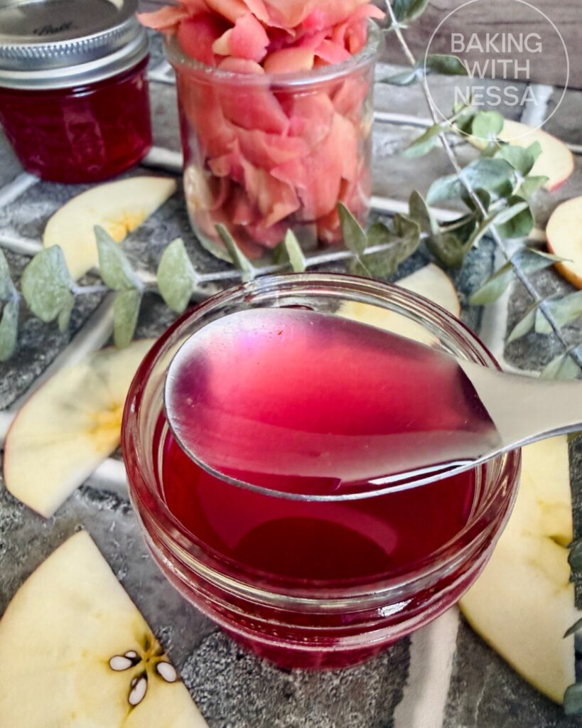 IMPORTANT:Depending on the type of apple peels you use the final color might differ in shades of pink. For example in this recipe, I used essentially galas apples with a few golden delicious. The more red the apples are the more dark pink the shade will be. And if you use yellow or green apples the syrup will result in more of a white grape juice color.
