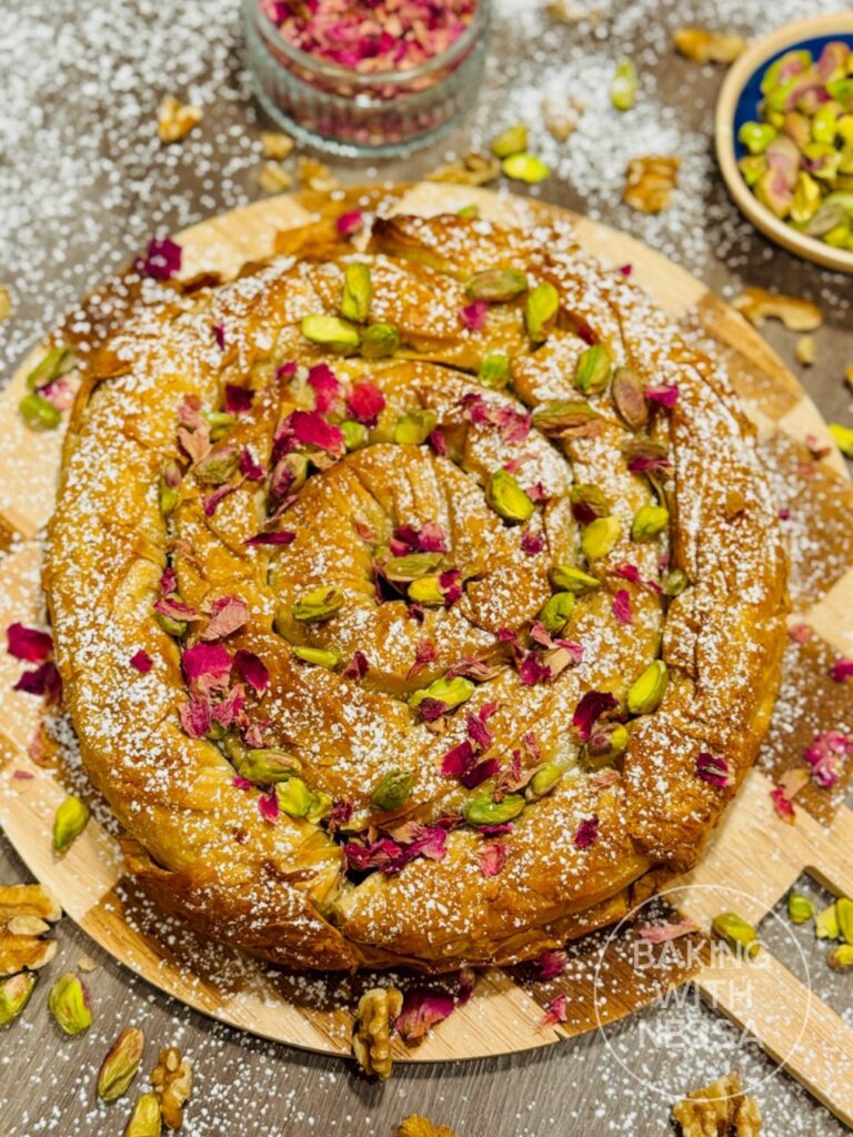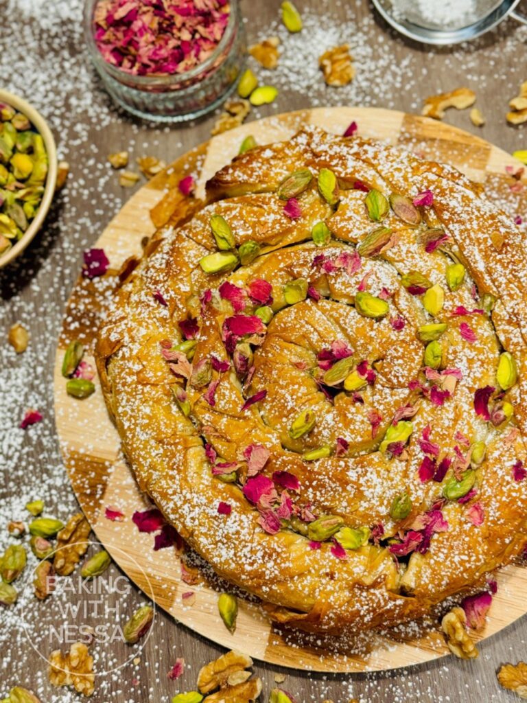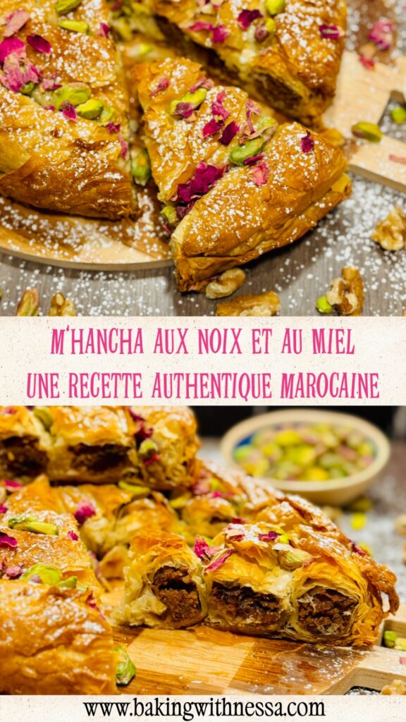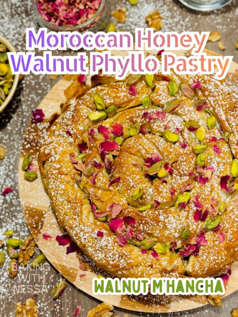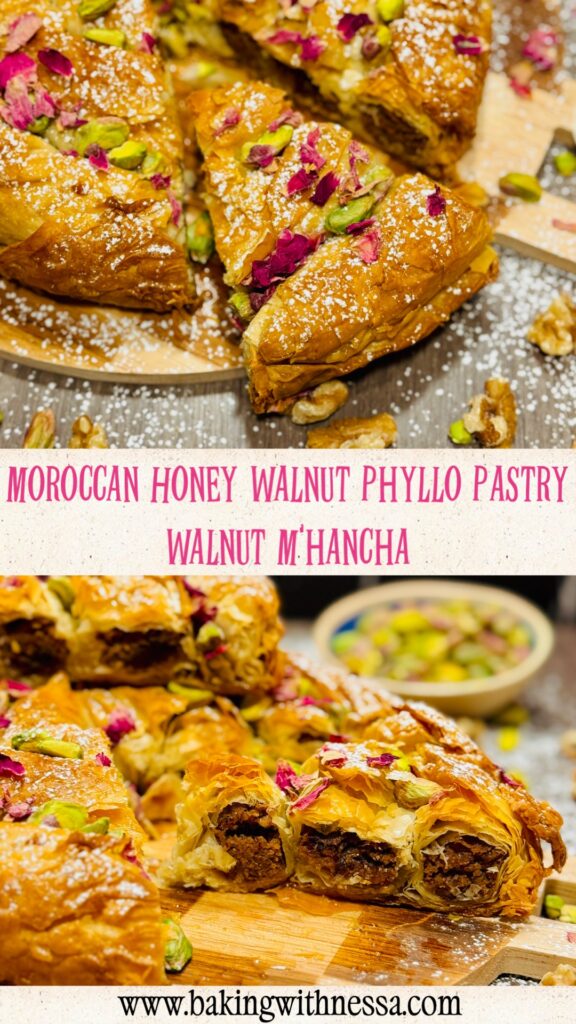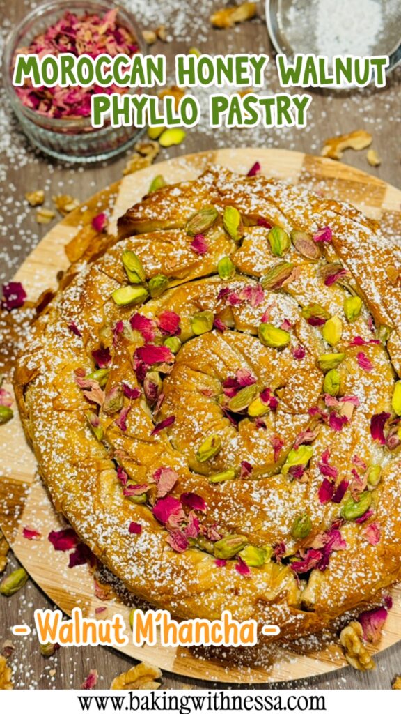 Moroccan Honey Walnut Phyllo Pastry, traditionally called Walnut M’hancha, is a stunning dessert made with flaky phyllo dough, walnuts, and fragrant orange blossom honey. This traditional Moroccan pastry is crispy, golden, and perfect for holidays, Ramadan, or elegant dinner parties!