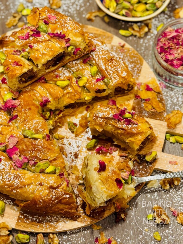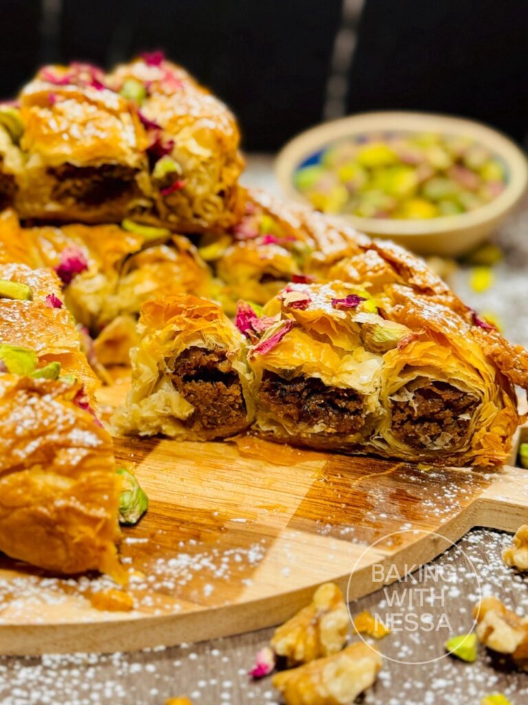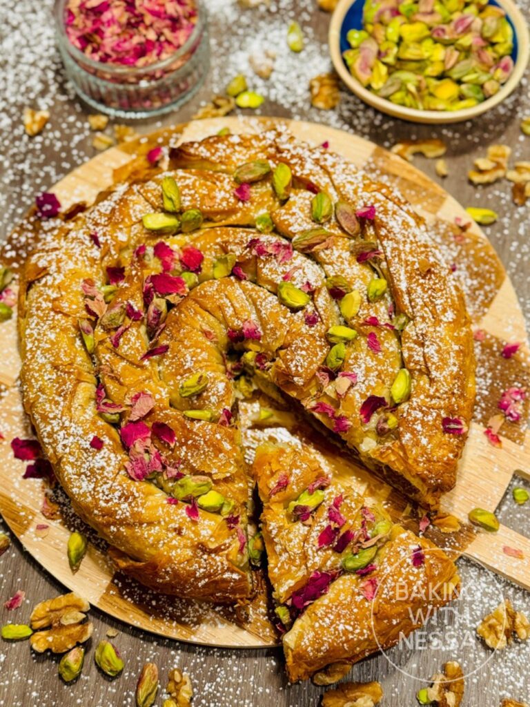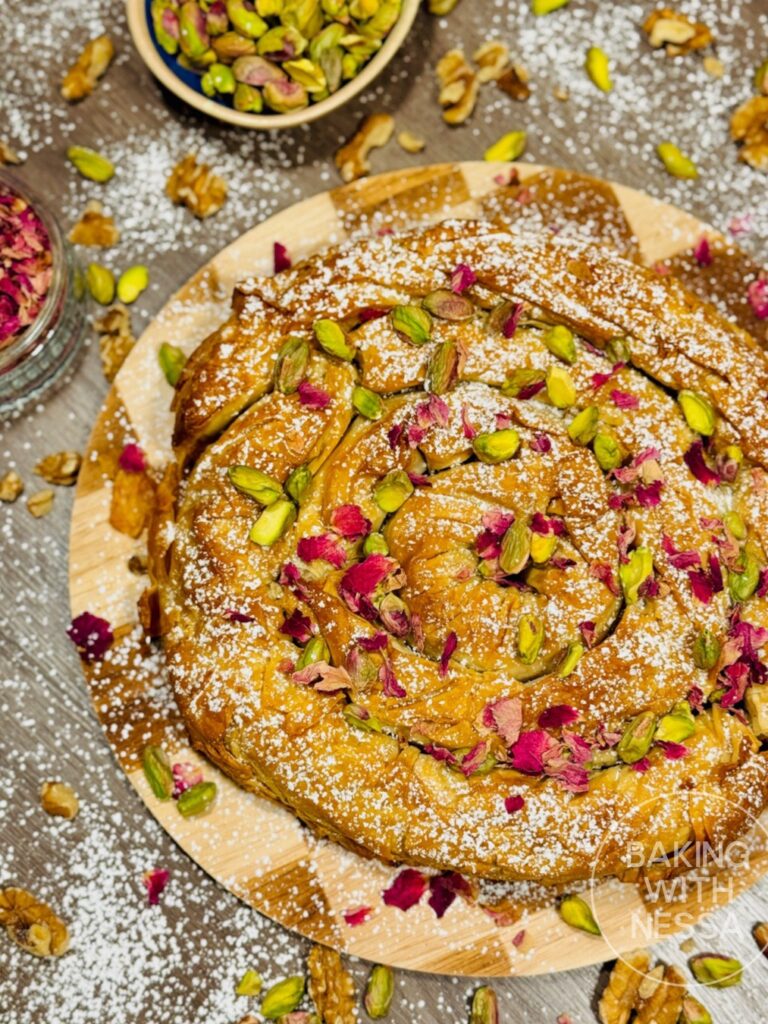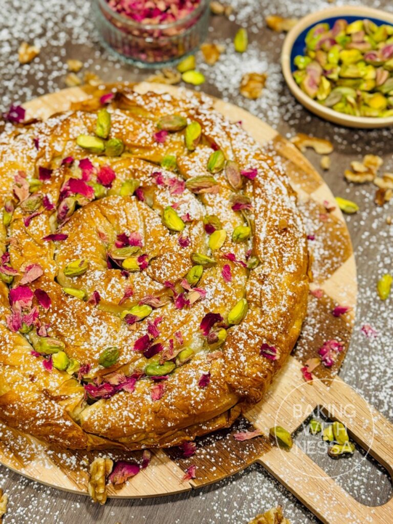 Moroccan Honey Walnut Phyllo Pastry, traditionally called Walnut M’hancha, is a stunning dessert made with flaky phyllo dough, walnuts, and fragrant orange blossom honey. This traditional Moroccan pastry is crispy, golden, and perfect for holidays, Ramadan, or elegant dinner parties!