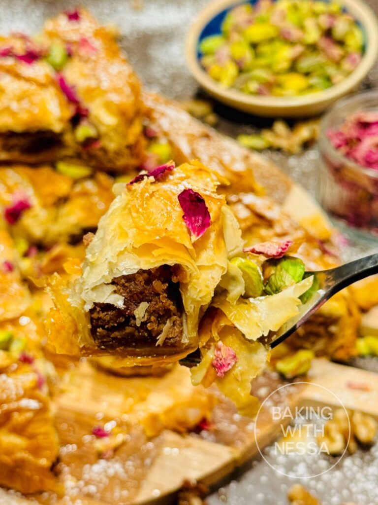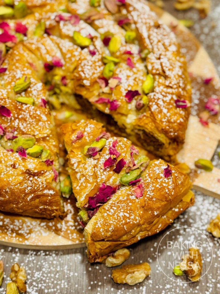 Serve warm or at room temperature. Dust powdered sugar on top and sprinkle pistachios and dried rose petals. Enjoy and Ramadan Kareem!