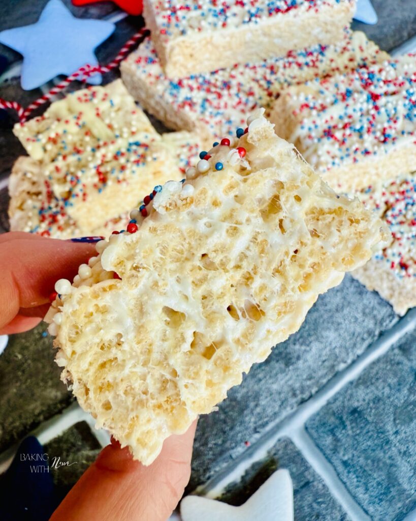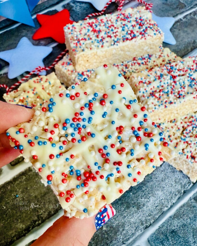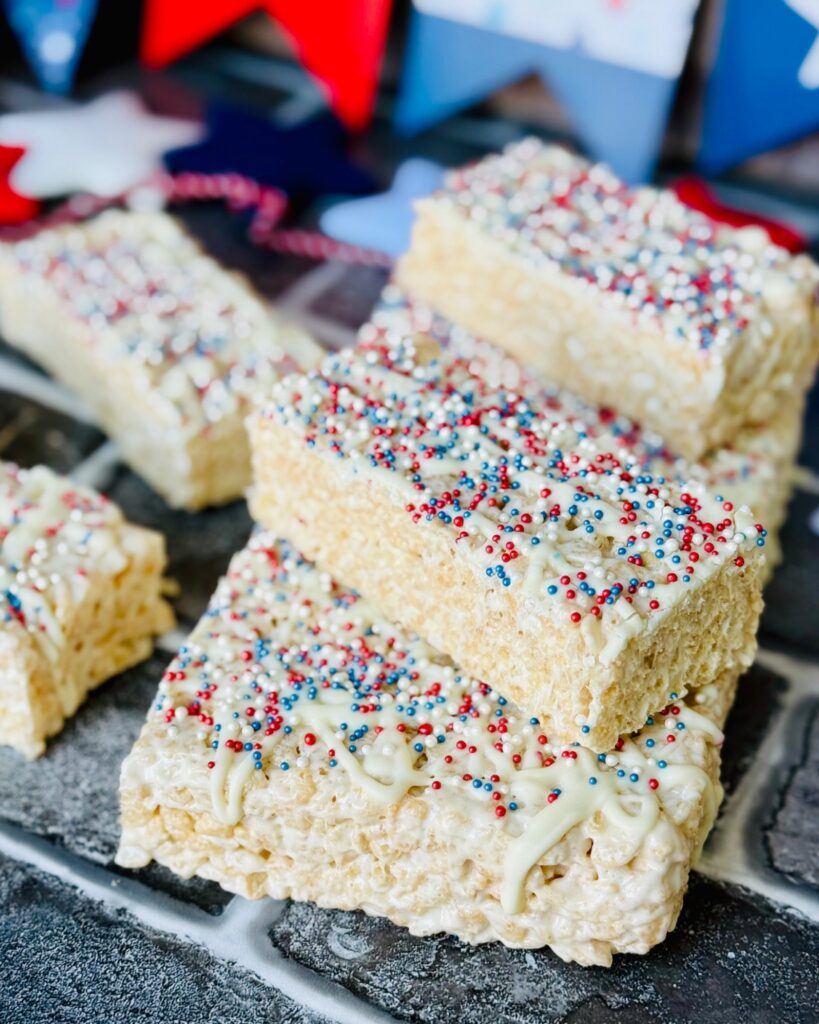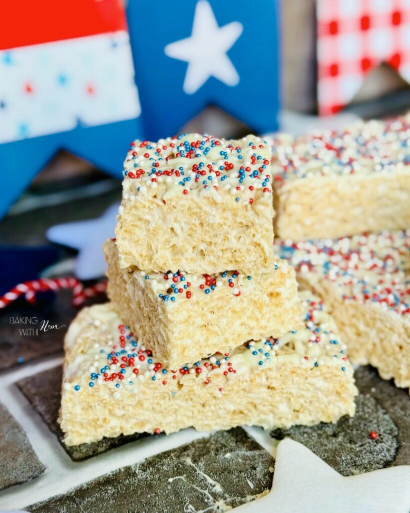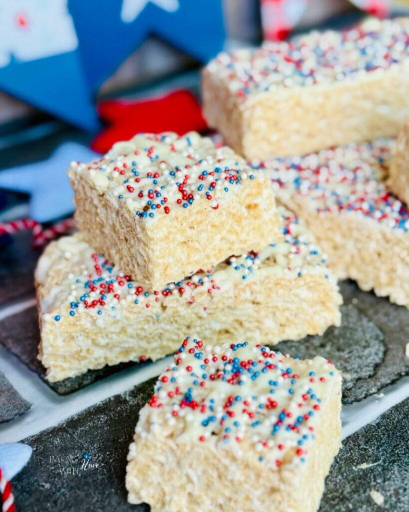 Get ready to celebrate in style with these festive Patriotic Rice Krispies Treats! Dressed in vibrant red, white, and blue sprinkles, these no-bake delights are the perfect way to add a touch of sweetness to your 4th of July festivities. Easy to make and even easier to devour, they are sure to be a hit with kids and adults alike!