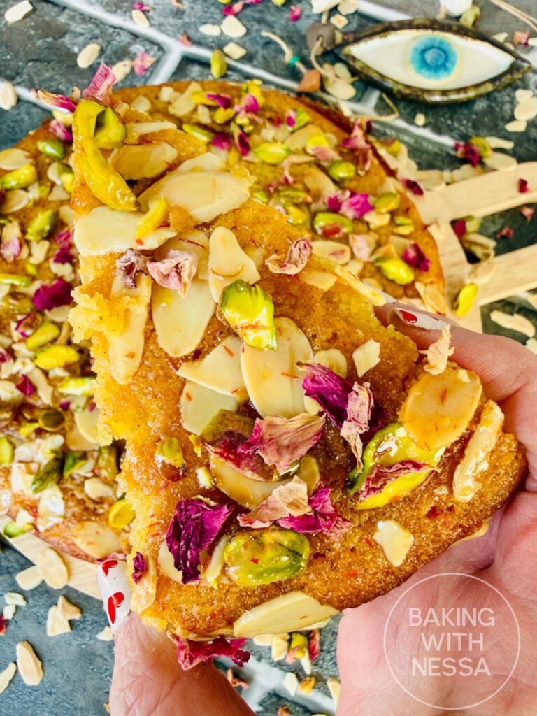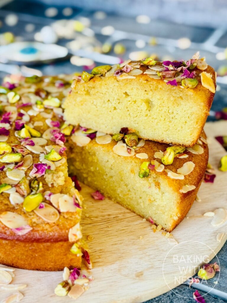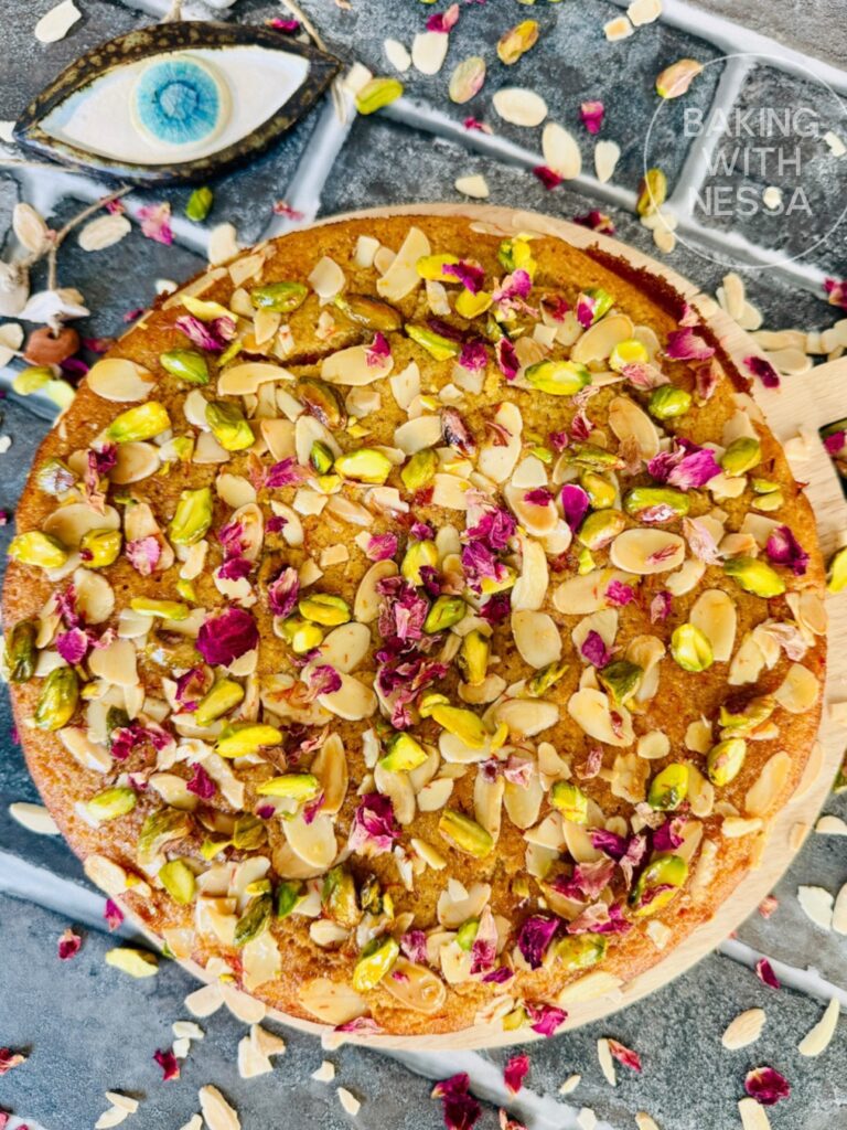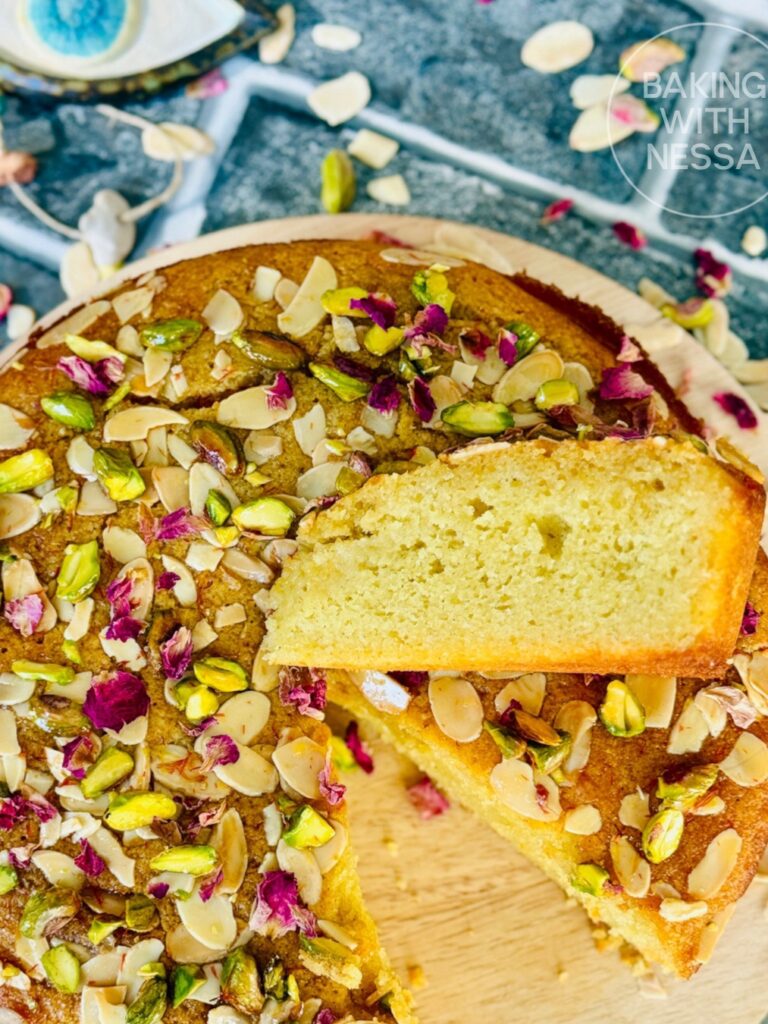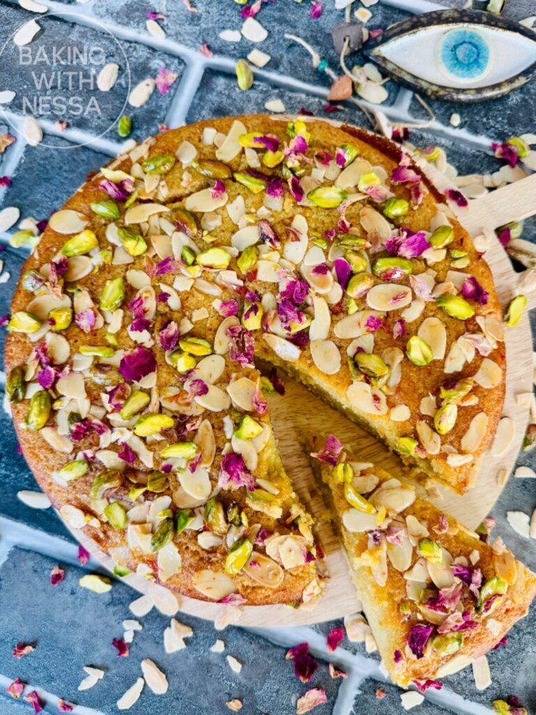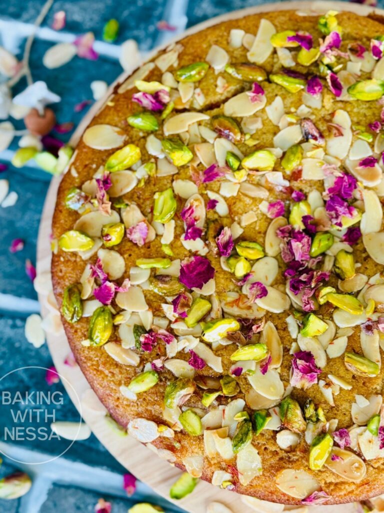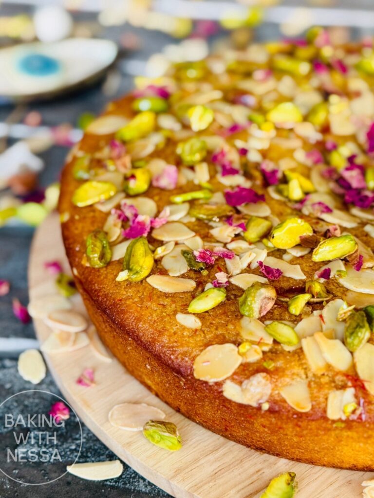 Stir in the rose water and saffron threads into the syrup. Turn off the heat and add the pistachios. Let it cool down completely.NOTE: Remember for optimal moisture is to follow the rule of opposites: pour cold syrup over a hot cake to help the cake absorb the syrup.