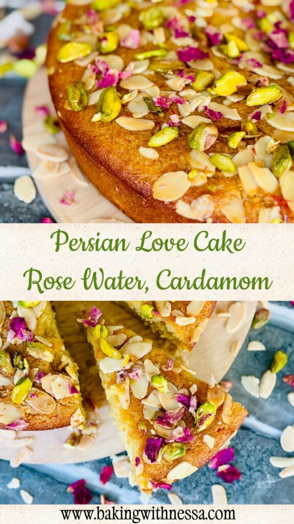 Once your Persian Love Cake is out of the oven, using a thin wooden skewer or a sharp pointed kitchen utensil poke fine holes all over the cake.Pour the cooled-down syrup over the hot cake and let the syrup soak in for several hours or best overnight.Decorate with dried edible rose petals. Enjoy & Bon Appétit!NOTE: This cake is best enjoyed within 3 days stored at room temperature covered.