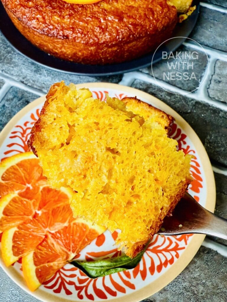 Once the Portokalopita has been removed from the oven, use a tooth pick to poke the cake all around.Pour evenly the cold syrup on top of the hot cake, one ladle at at time. Allow each ladle to be absorbed into the cake before adding the next one. Repeat until all of the syrup has been used.NOTE: You will see the syrup is being absorbed very quickly.