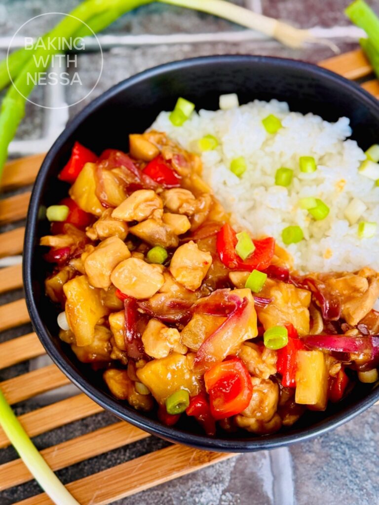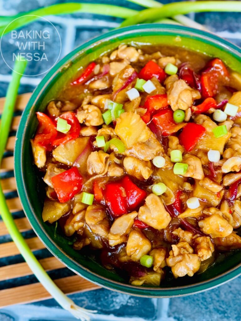 Return the diced chicken to the pan, pour over the sauce add the pineapple chunks along with 2 tablespoons from the juice. Gently mix to coat the chicken and bring it a boil. Then reduce the heat to medium-low and cook for about 10 minutes.