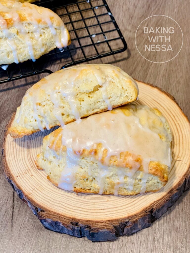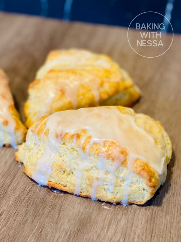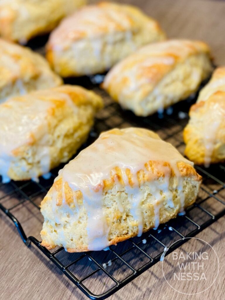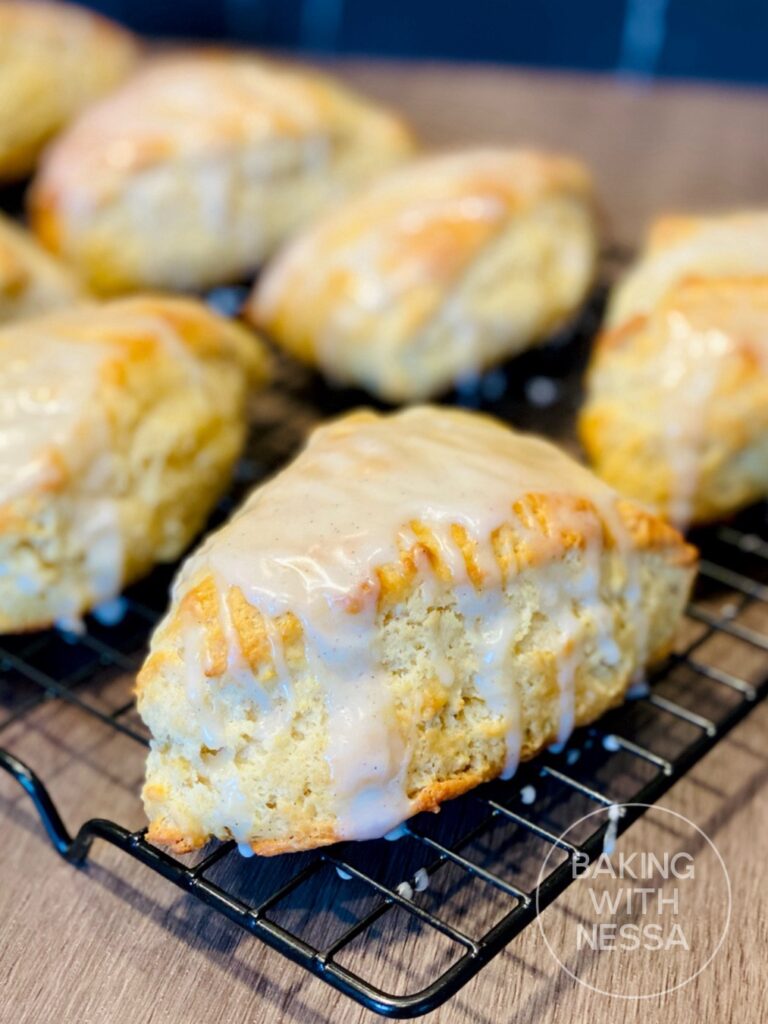 Bake for 20 minutes at 400℉/200℃. (Every oven heats differently, monitor your scones from 18 minutes). It is ready when the scones have risen and are golden brown around the edges, the top being lightly brown.Once your Vanilla Bean Scones are out of the oven, let them cool down on the baking sheet while preparing the vanilla bean glaze.