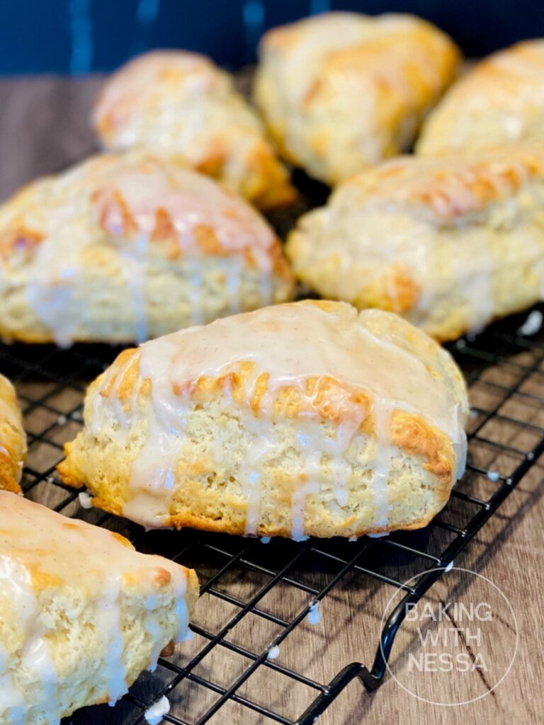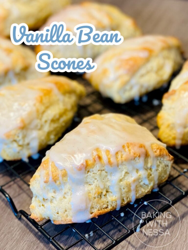 In a small bowl, combine the powdered sugar together with the vanilla bean paste and milk. Drizzle over the warm scones. Enjoy & Bon Appétit!NOTE: The Vanilla Bean Scones are best stored at room temperature in a single layer. Avoid plastic container as they will get soggy. Like every type of bread these are best enjoyed the same day.
