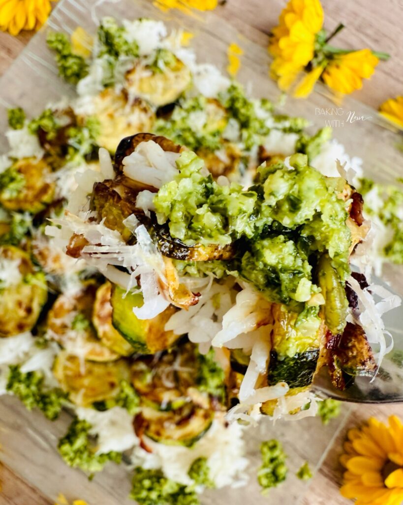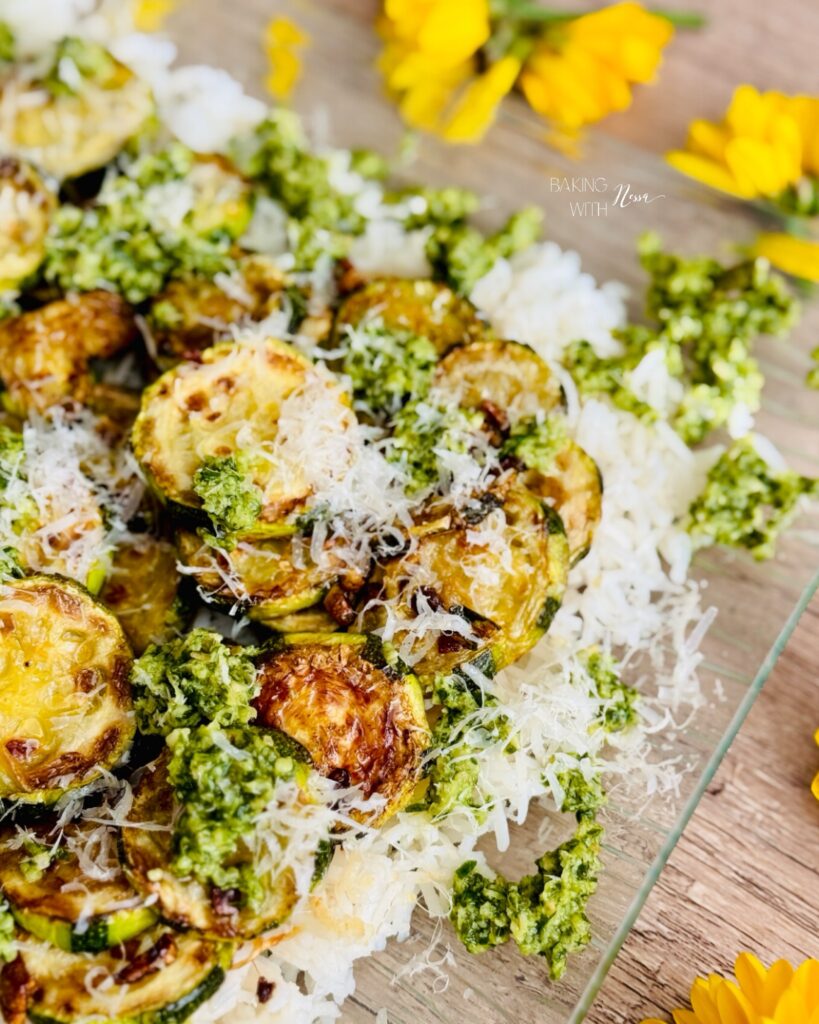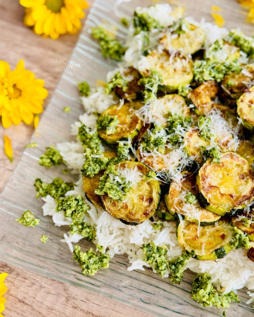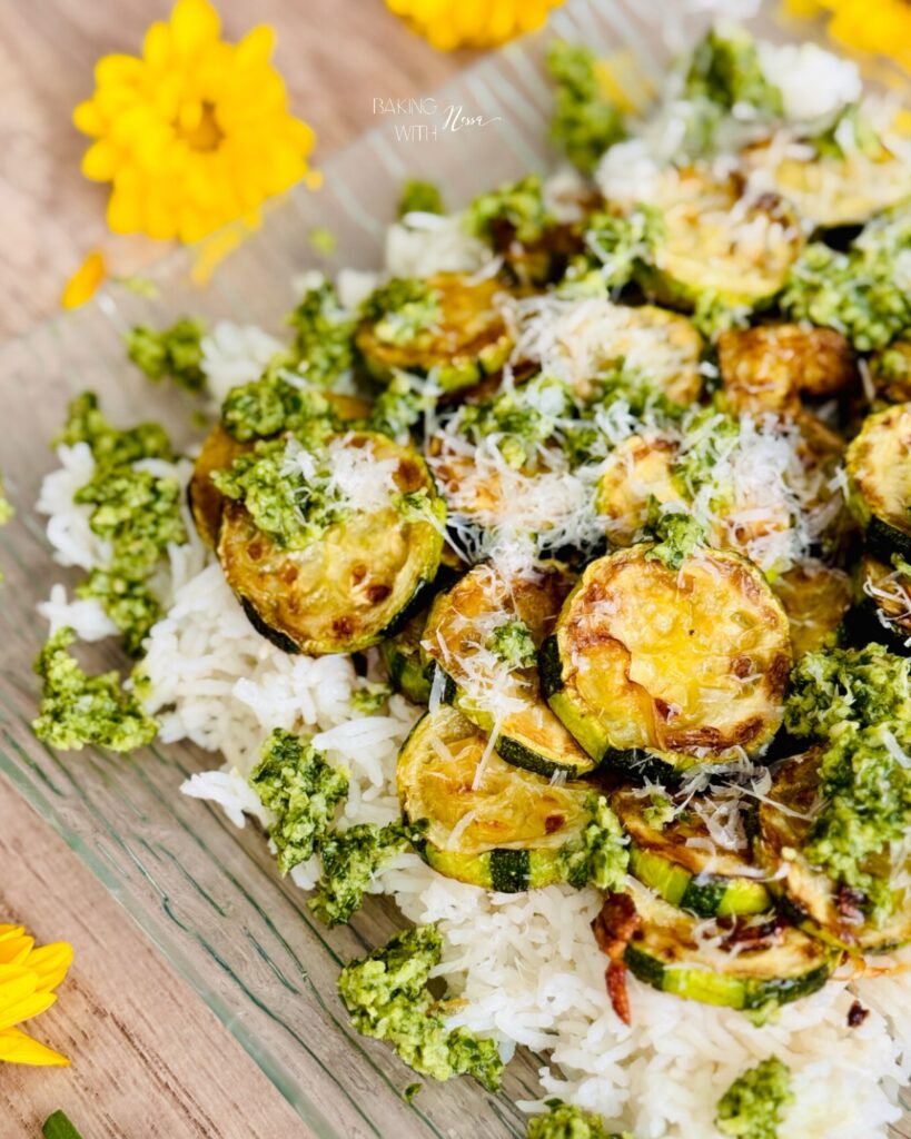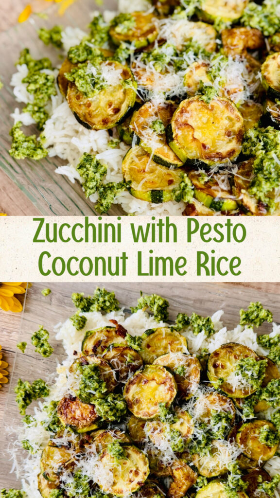 On a service platter, layer the coconut lime rice, then the zucchini, add dollops of pesto and finish with grated parmesan on top. Enjoy & Bon Appétit!
